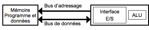 L’architecture de Von Neumann a la particularité de ne posséder qu’une seule mémoire dans laquelle sont stockées instructions et données. Il faut donc partager le bus de données venant de cette mémoire. Cette structure est souvent utilisée pour les microcontrôleurs et microprocesseurs car elle est très simple à manier pour le programmeur. Ainsi, c’est celle qui est utilisée dans la famille des microprocesseurs Motorola 68XXX et Intel 80X86.