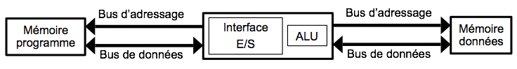 On voit tout de suite la différence : les mémoires sont séparées. Cette séparation apporte deux avantages majeurs : les adressages et le transit des données sont plus simples et il est possible de placer des données dans la mémoire programme pour les algorithmes complexes.