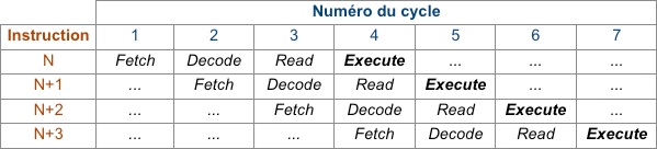 Il s’agit plus d’une méthode que d’une spécificité physique. La méthode du pipeline impose une cadence dans l’exécution des instructions en les divisant en quatre opérations élémentaires, optimisant ainsi la rapidité d’exécution générale. Ces quatre opérations élémentaires sont :