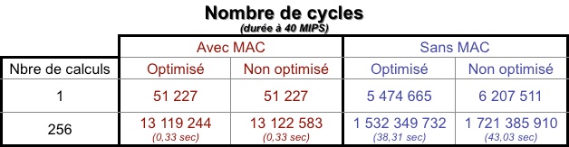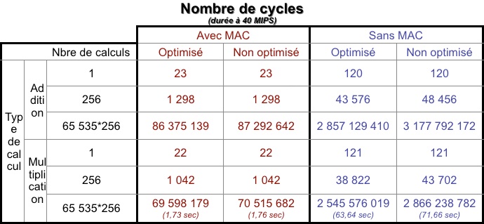 À environ 40 MIPS, on obtient un temps de 1,66 secondes avec MAC contre 1 minute et quelques dixièmes sans MAC, et tout cela pour 16 776 960 multiplications.
