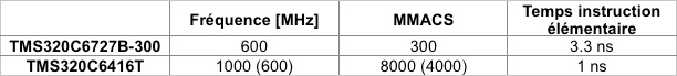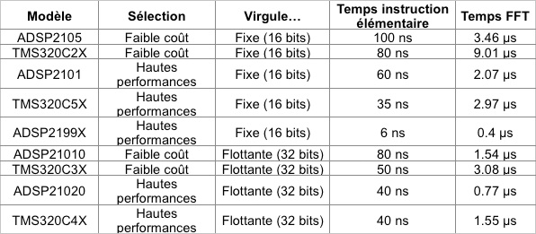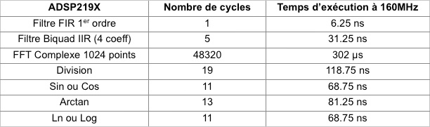 Voici un tableau résumant les performances des DSP de la famille ADSP219X produit par Analog Device :